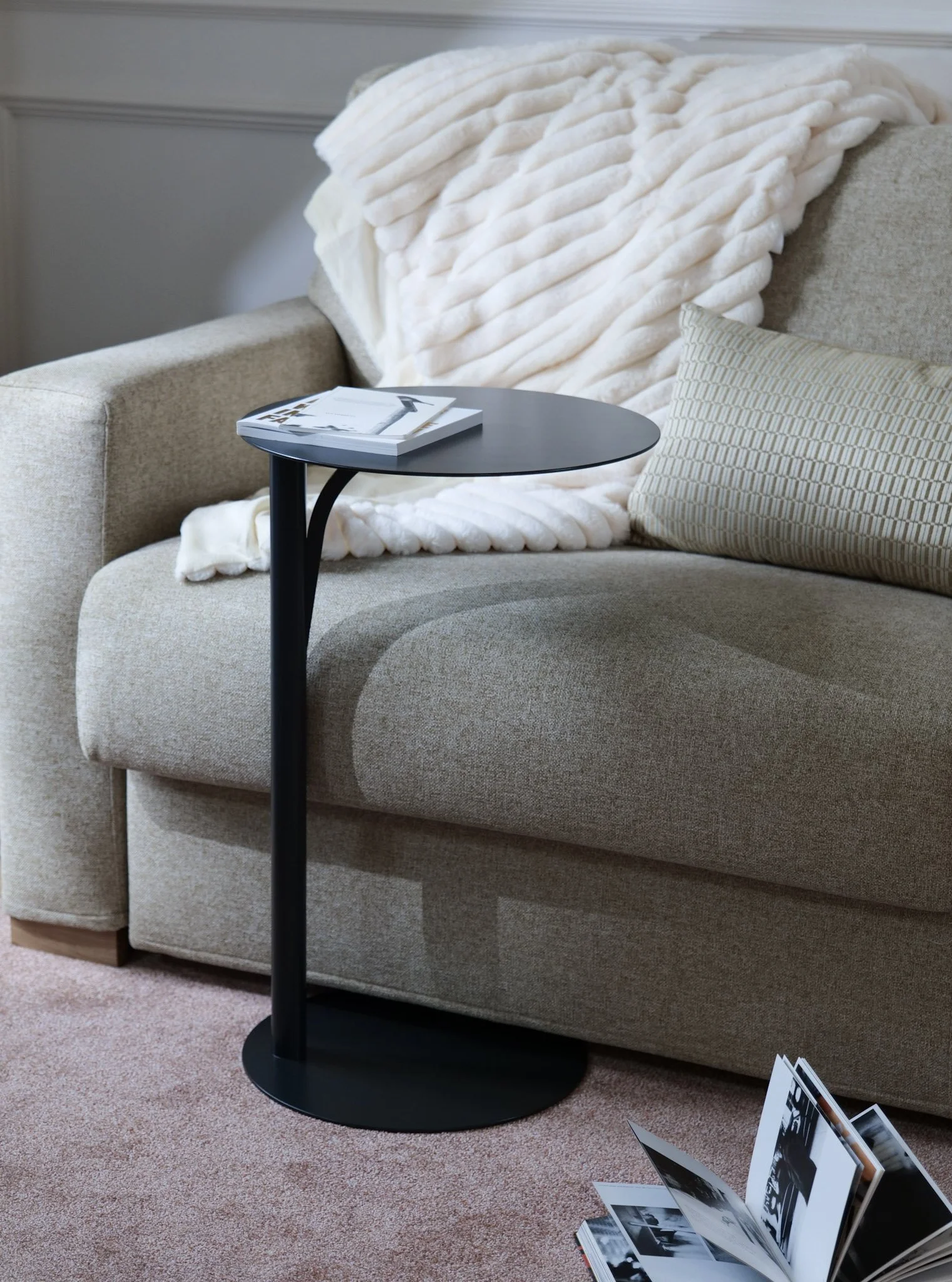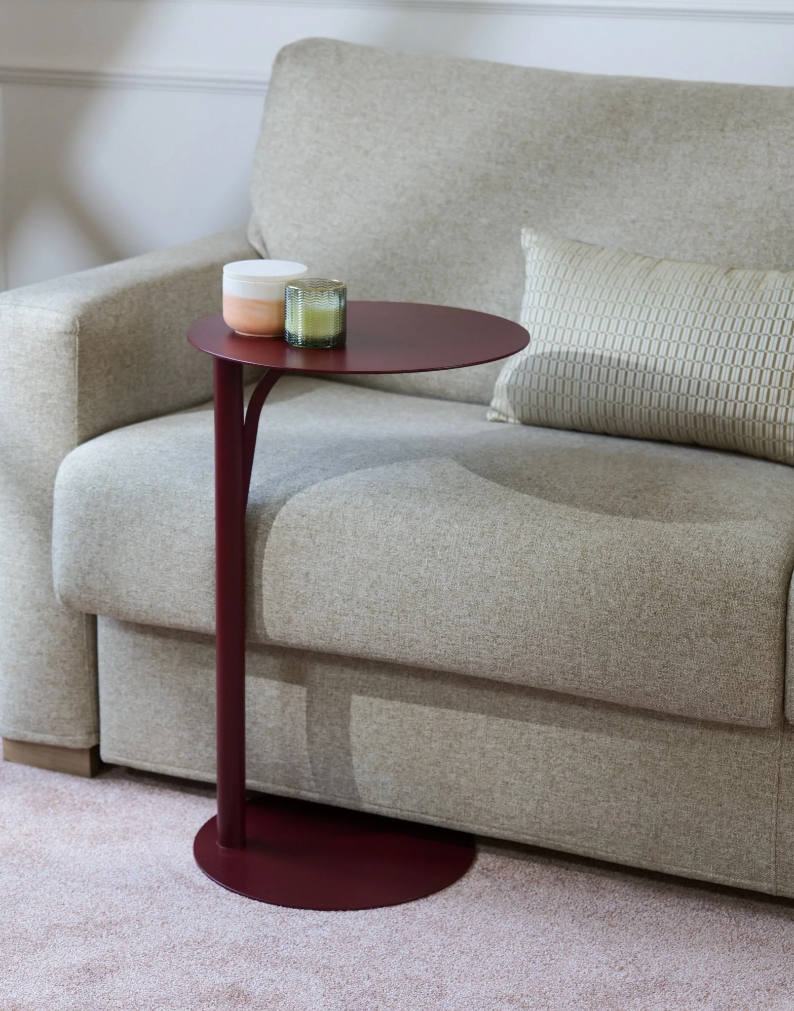 Une petite table au design élégant à placer à côté d’un canapé,